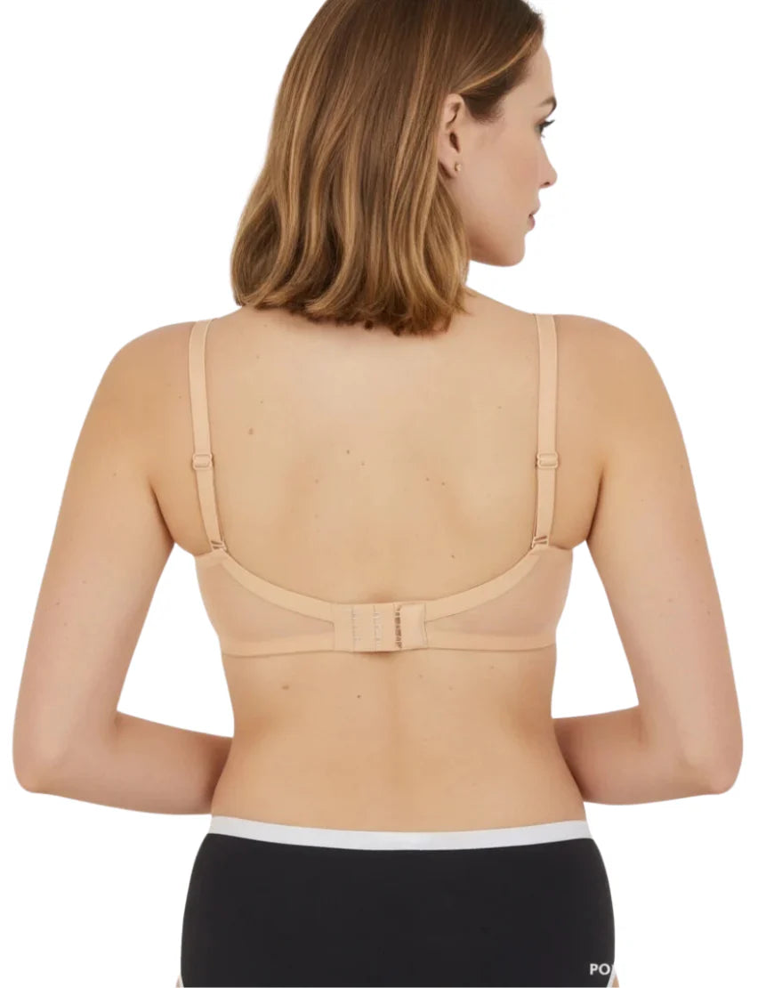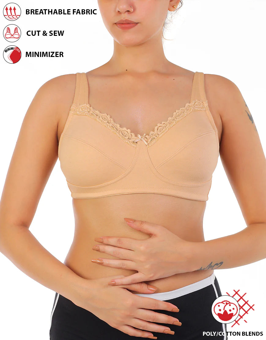 This is a super support cut & sew cup minimizer bra. It gives perfect support and the blended cotton fabric gives a very comfortable feel on skin. Fabric is breathable and the power mesh wings gives it some elegance as well. Front straps have a wide base attached to the cup for good support and comfort. It has mid high panel giving a perfect full coverage with no spillage at all.